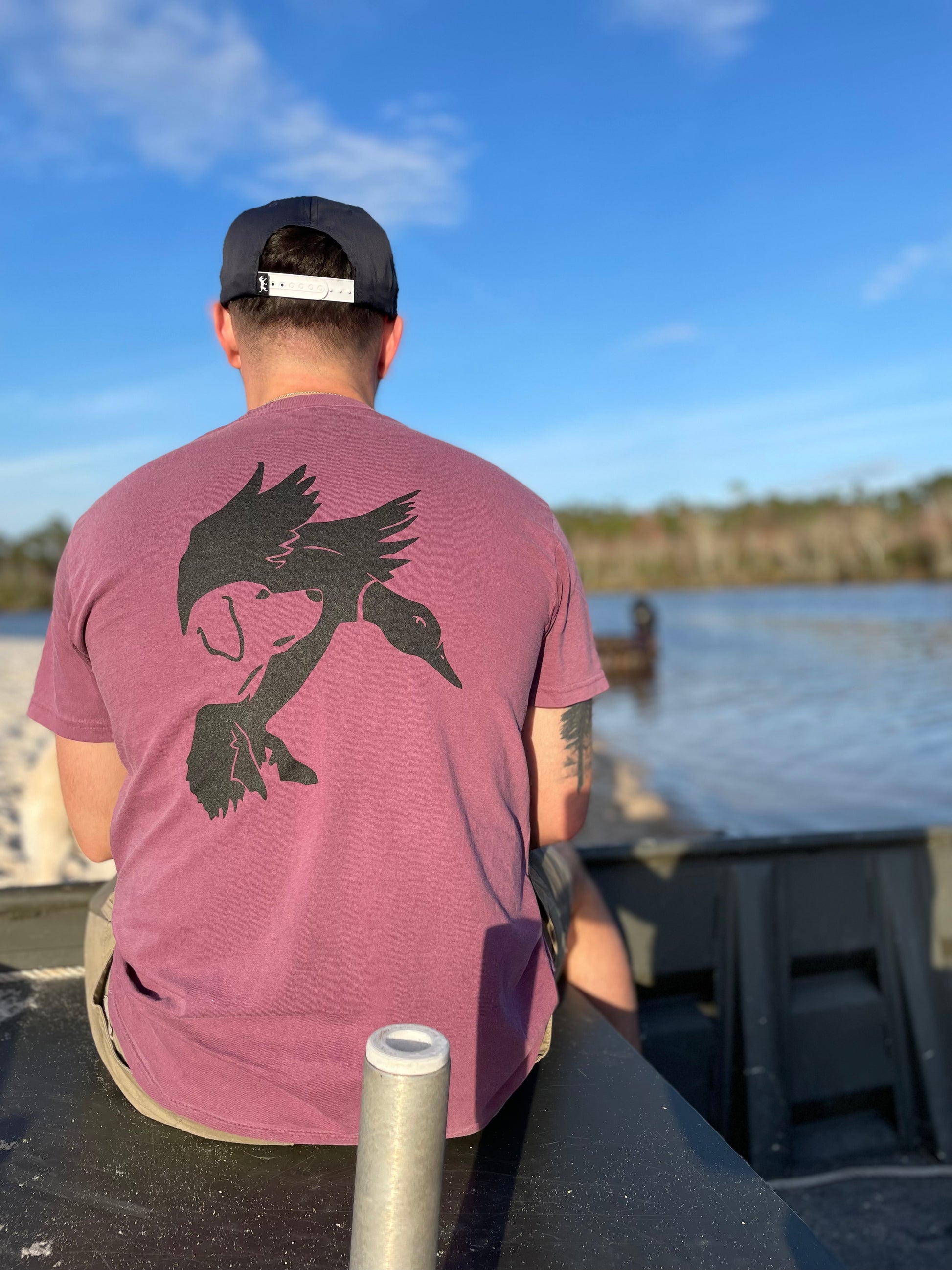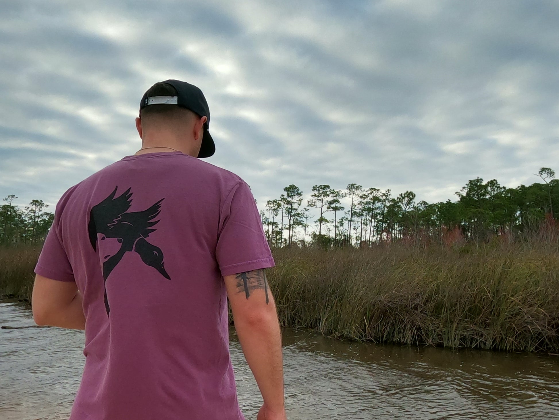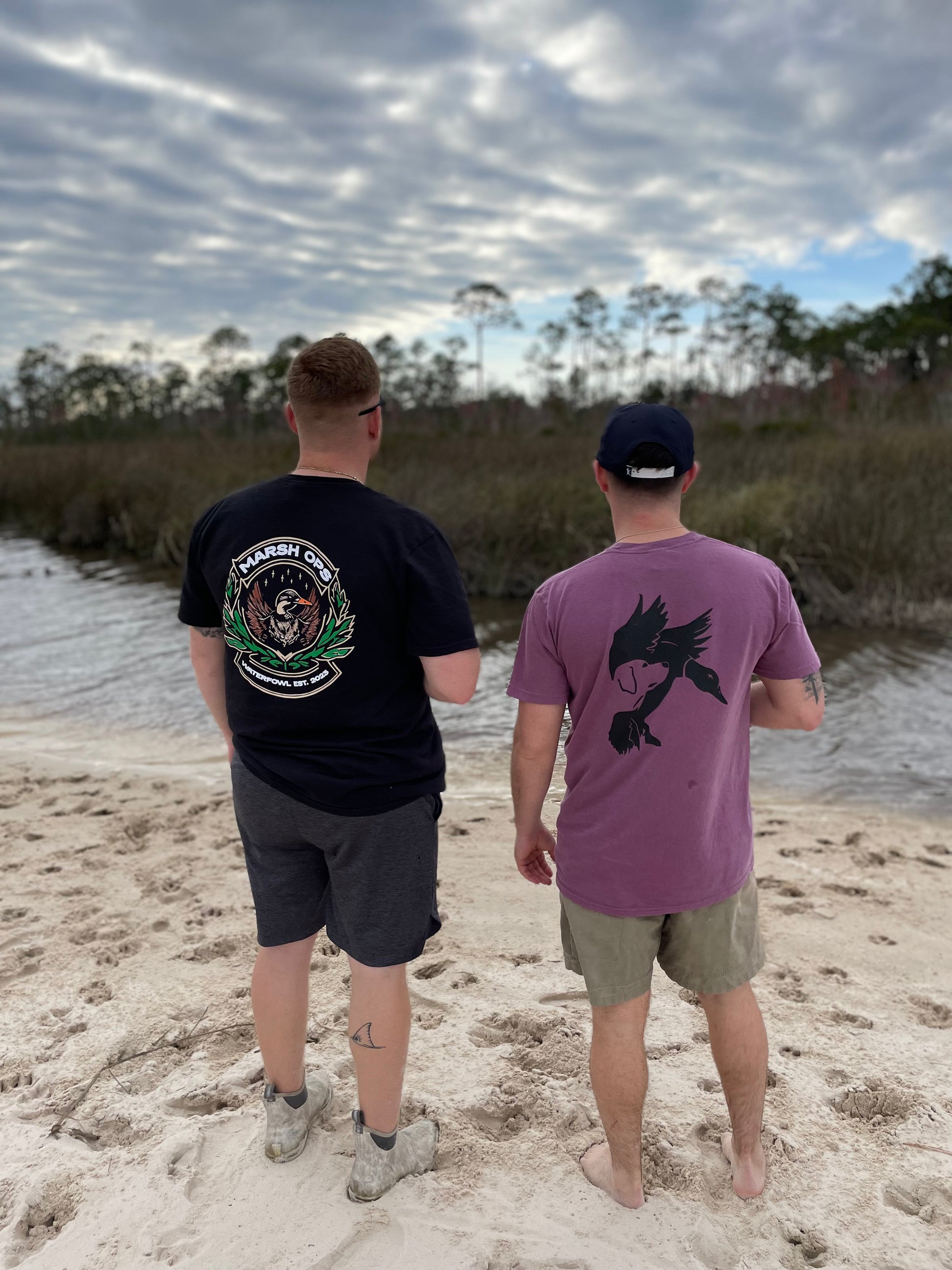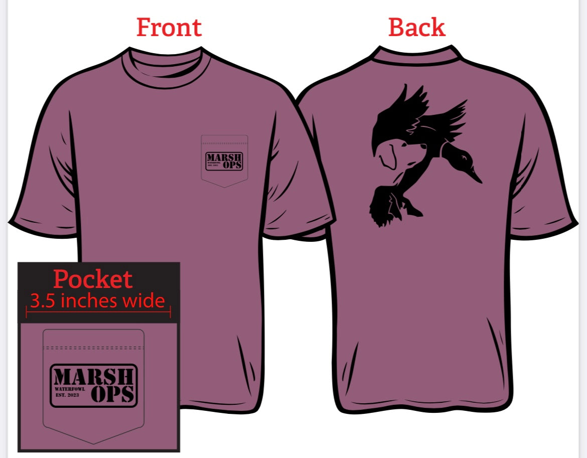 Marsh Ops Waterfowl's Berry colored Comfort Color shirt is a must-have for any waterfowl enthusiast. This shirt features a convenient pocket on the front and showcases Marsh Ops' signature Duck and Dog logo on the back. Made with 100% cotton, this shirt is comfortable and durable, perfect for any outdoor adventure. The relaxed fit and vintage feel make it a stylish addition to any wardrobe. Show off your love for waterfowl hunting with this classic and comfortable shirt from Marsh Ops Waterfowl.