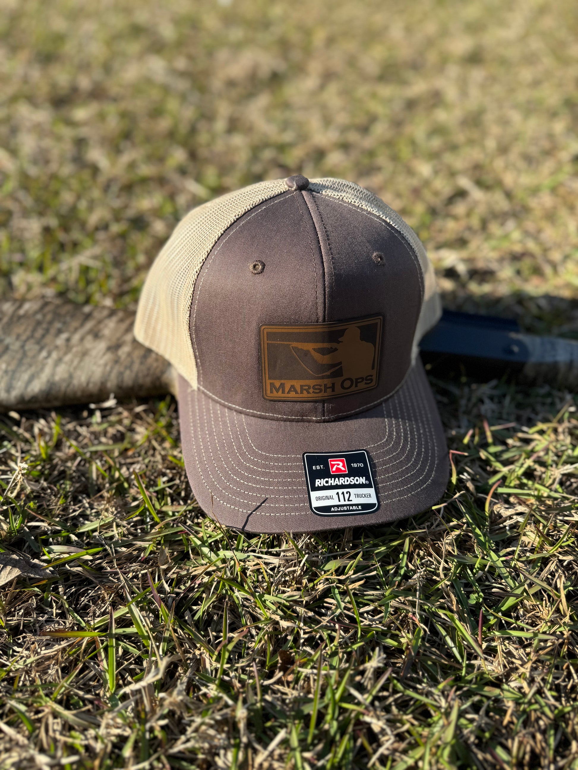 The Richardson 112 hat has a curved visor and a mesh back that allows for breathability. The front of the hat features a Marsh Ops Major League Duck Hunter patch. The hat is adjustable and can fit most head sizes.